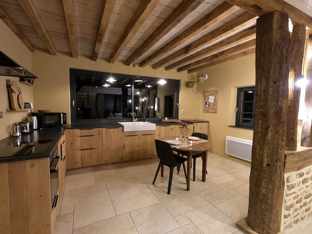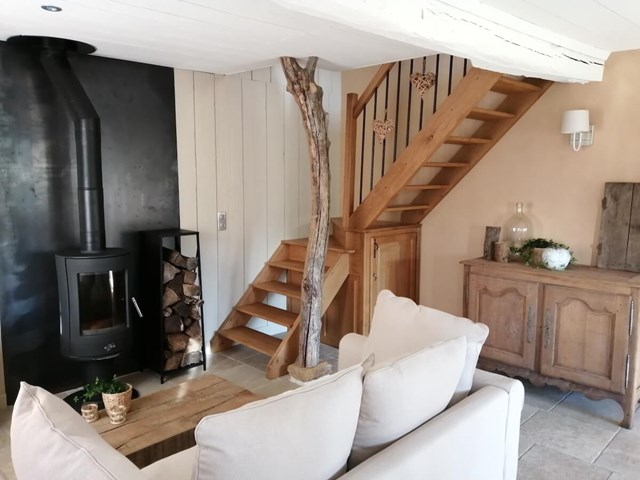 Au rez-de-chaussée, vous profiterez d'un séjour de 28 m2 composé d’une cuisine équipée (lave-vaisselle, four, plaques électriques, grille pain, cafetière, micro-ondes) et d’un salon avec poêle à bois, avec canapé lit confort et écran plat WiFi.
