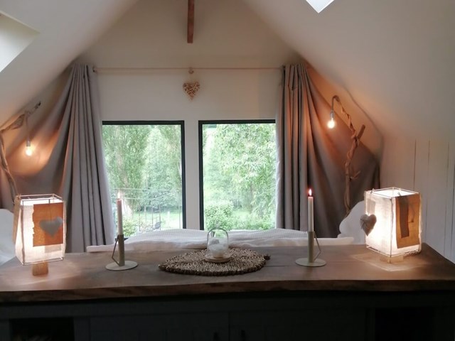 À l'étage, vous profiterez d'une chambre avec lit de 160 cm équipé d'un matelas confort, salle de douche, toilettes.